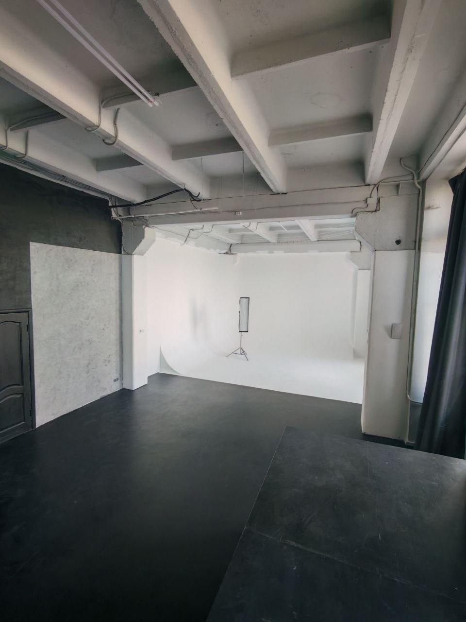 • Стильный минимализм: пространство разделено на две части – белая часть с циклорамой и высокие потолки визуально расширяют пространство, а чёрная часть зала с лаконичным чёрным подиумом отлично подойдёт для чёрно-белых портретов.